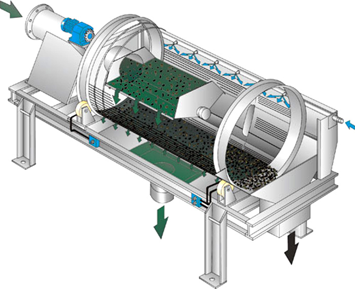 大型滾筒篩通過數(shù)片并列的篩條構(gòu)成篩孔并形成篩面,篩筒旋轉(zhuǎn)利用物料的自重進(jìn)行篩分,破碎的石料進(jìn)入滾筒后,靠滾筒旋轉(zhuǎn)的離心力及跳汰作用來篩分物料。通過不同網(wǎng)目的篩網(wǎng)逐一篩出。不同規(guī)格的石料篩出后經(jīng)漏斗落入皮帶機(jī)送至成品料場(chǎng)。靠滾筒旋轉(zhuǎn)的離心力及跳汰作用來篩分物料,通過不同網(wǎng)目的的篩網(wǎng)逐漸被篩出。