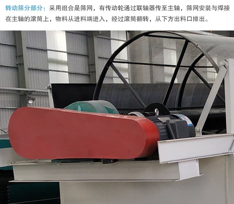 轉動篩分部分:采用組合是篩網,有傳動輪通過聯軸器傳至主軸,篩網安裝與焊接在主軸的滾筒上,物料從進料端進入,經過滾筒翻轉,從下方出料口排出。